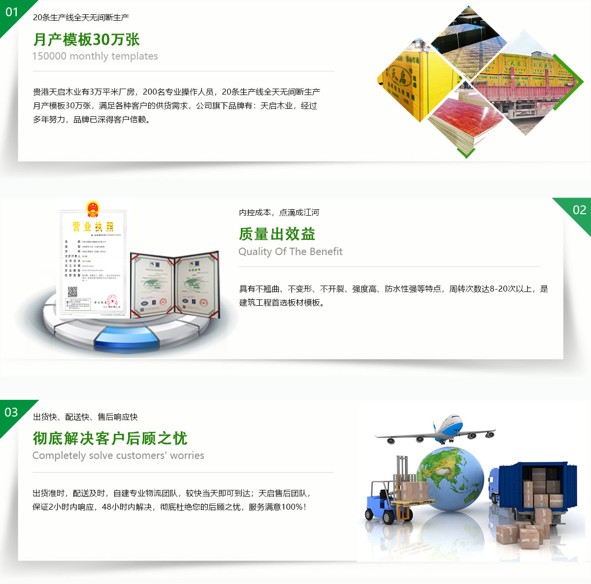 貴港市天啟木業(yè)位廣西貴港市覃塘區(qū),是中國(guó)建筑模行業(yè)規(guī)模十大的企業(yè)之一,有著優(yōu)越地理位置,臨廣東,貴州,湖南,云南、交通運(yùn)輸區(qū)位十分優(yōu)勢(shì)。現(xiàn)有職工近300人,占地50余畝,其中建筑面積近3萬(wàn)平方米。日產(chǎn)量2萬(wàn)張,年產(chǎn)量500萬(wàn)余張;公司正在逐步壯大,旗下有4家分公司,總年產(chǎn)量近1500萬(wàn)張!天啟木業(yè)引進(jìn)芬蘭制膠技術(shù),采用先進(jìn)生產(chǎn)工藝。公司生產(chǎn)的建筑膜板采用優(yōu)質(zhì)的防水膠制作,循環(huán)使用次數(shù)多,品質(zhì)在同行業(yè)內(nèi)認(rèn)可度極高。是一家集產(chǎn)品研發(fā),生產(chǎn),銷(xiāo)售,服務(wù)于一體的綜合型大型民營(yíng)企業(yè)。產(chǎn)品覆蓋全國(guó)20多個(gè)省,市,自治區(qū)。